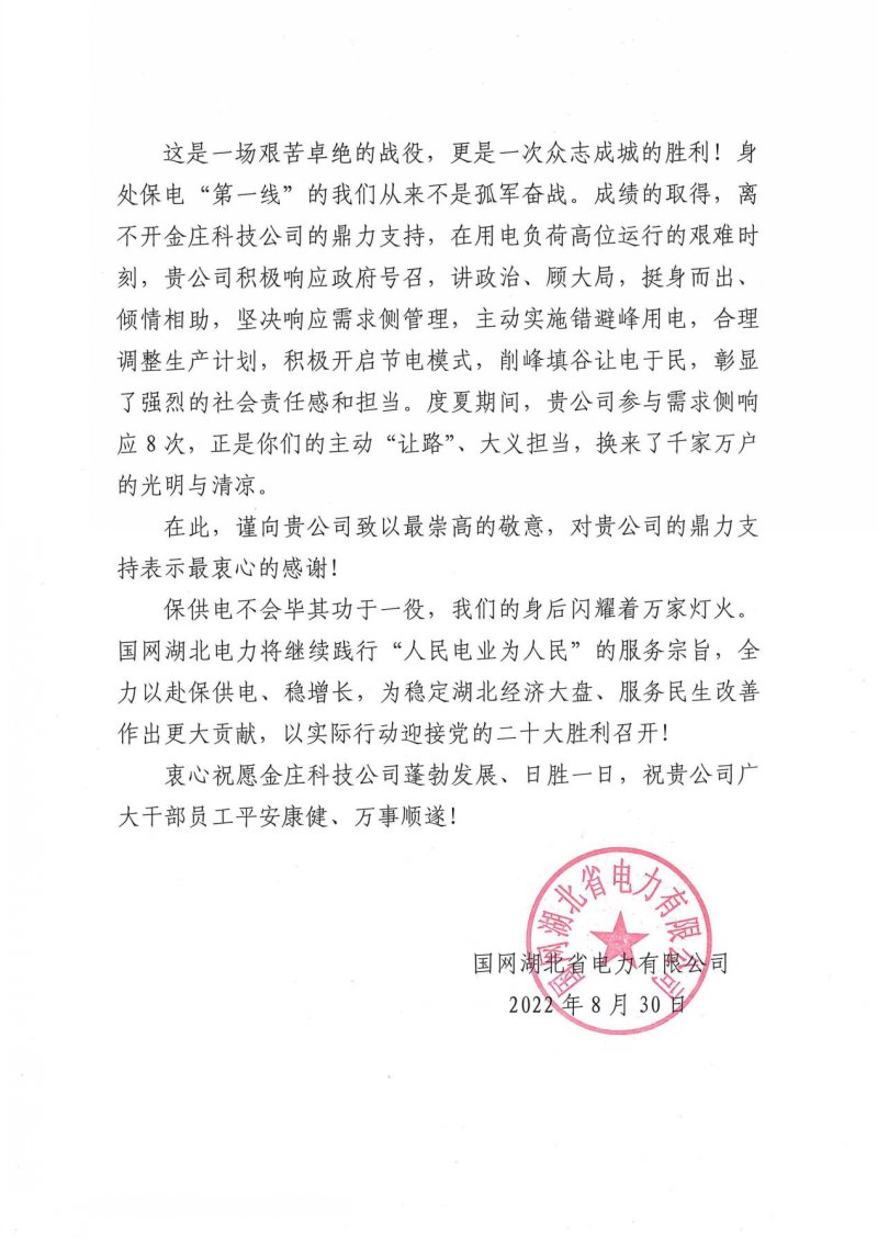 國(guó)網(wǎng)湖北省電力有限公司在感謝信中寫(xiě)到,在用電負(fù)荷高位運(yùn)行的最艱難時(shí)刻,金莊科技積極響應(yīng)政府號(hào)召,講政治、顧大局,挺身而出、傾情相助,堅(jiān)決響應(yīng)需求側(cè)管理,主動(dòng)實(shí)施錯(cuò)避峰用電,合理調(diào)整生產(chǎn)計(jì)劃,積極開(kāi)啟節(jié)電模式,削峰填谷讓電于民,彰顯了強(qiáng)烈的社會(huì)責(zé)任感和擔(dān)當(dāng)。度夏期間,金莊科技參與需求側(cè)響應(yīng)8次,正是你們的主動(dòng)“讓路”、大義擔(dān)當(dāng),換來(lái)了千家萬(wàn)戶(hù)的光明與清涼,對(duì)金莊科技的鼎力支持表示最衷心的感謝!