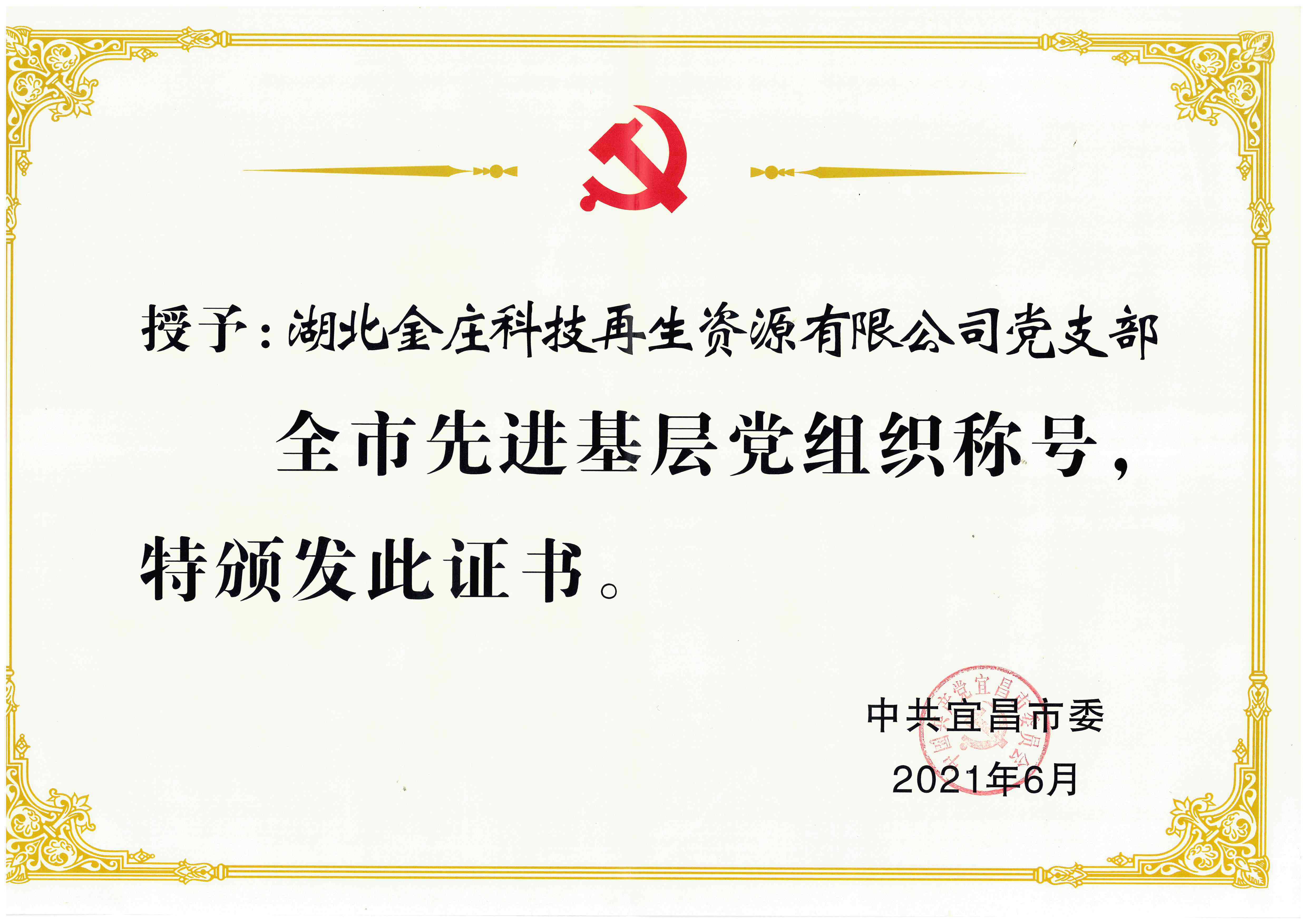 2021年度公司黨支部榮獲宜昌先進(jìn)基層黨組織